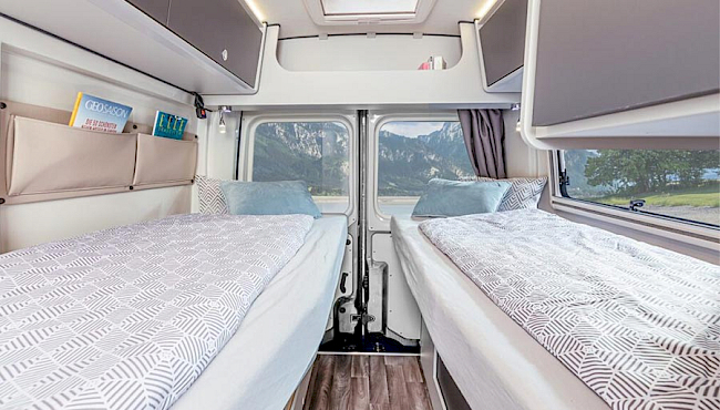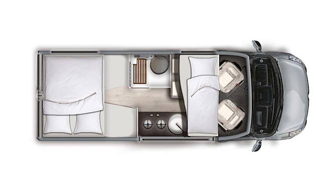 This camper van category features a spacious 140 x 200 cm bed, providing a comfortable and cozy sleeping experience for two people.